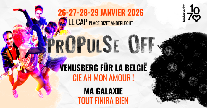 Op 26, 27, 28 en 29 januari 2026 tonen Cie Ah mon Amour! en Tout Finira Bien in het kader van Propulse Off hun nieuwste creaties. We verwelkomen u op een avondvullend programma met een aperitief en soep bij aankomst, en een maaltijd tussen de twee concerten.